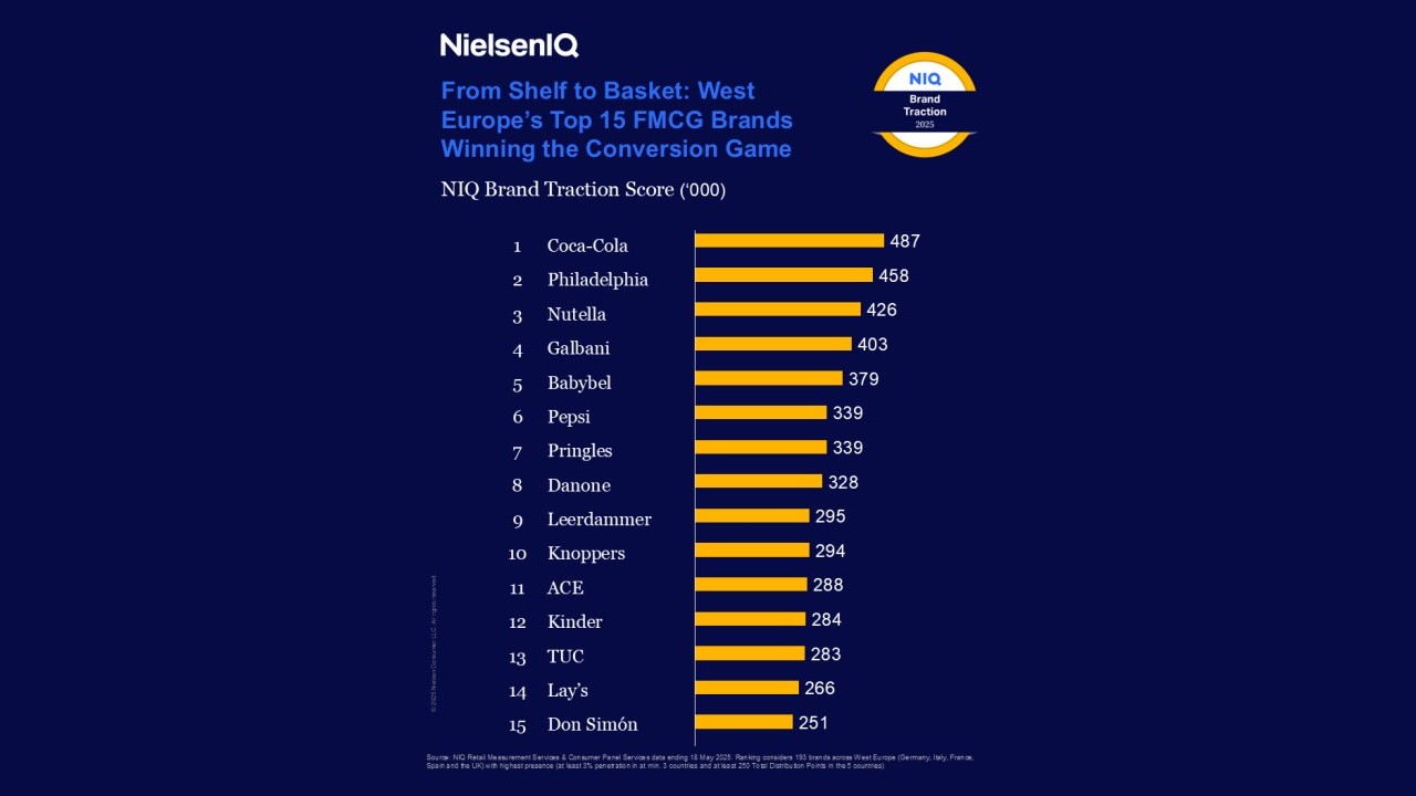 L’analisi condotta da NIQ mostra che, in Europa Occidentale – nello specifico Regno Unito, Germania, Francia, Spagna e Italia –, Coca-Cola ottiene il punteggio più alto (487) per conversione delle vendite, seguita da Philadelphia (458) e Nutella (426). Tra i primi 15 marchi predominano quelli dei prodotti legati al piacere e alla gratificazione personale, seguiti dai latticini – due categorie che beneficiano di un’ampia gamma di scelta, molteplici occasioni di consumo e cicli di acquisto brevi. Accanto ai marchi internazionali affermati, in classifica figurano anche forti player locali e specialisti di categoria.